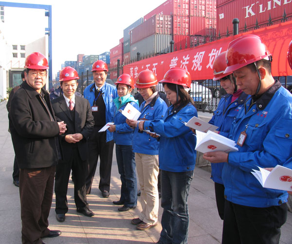 2006年12月14日,省交通厅徐佑林副厅长一行,为落实今年省交通厅“12.4”法制宣传教育活动,专门组织了送法上汉阳集装箱码头活动。