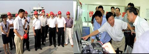 在武港集箱阳逻港区码头前沿,武汉港务集团总经理顾强生向杨传堂部长详细汇报了武港集箱阳逻港区码头建设、运行情况及武汉新港的整体规划,其中对码头安全管理工作内容做了重点汇报,并陪同杨传堂部长一行参观了中控室。